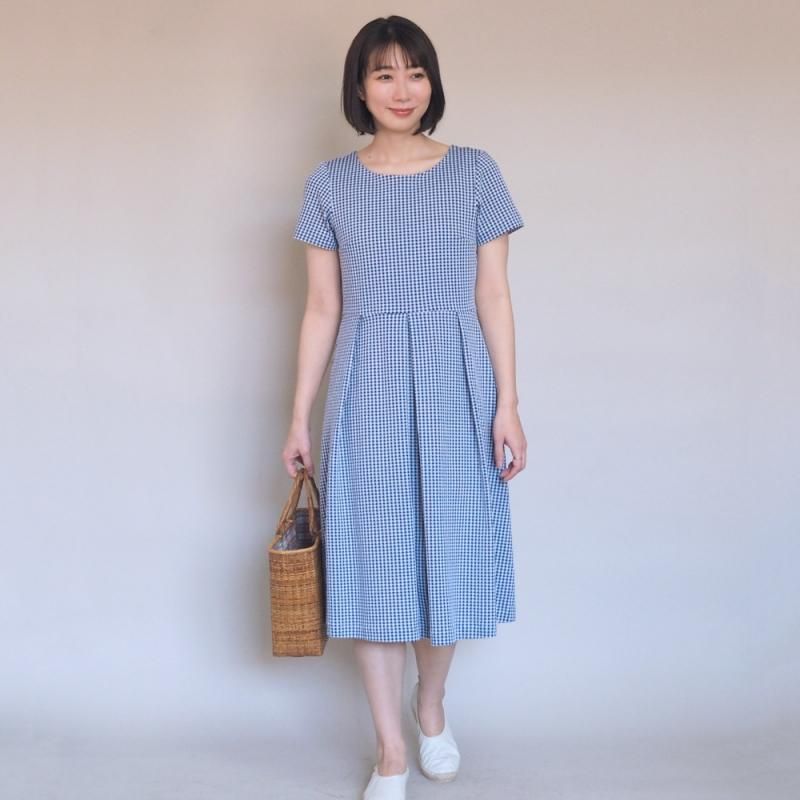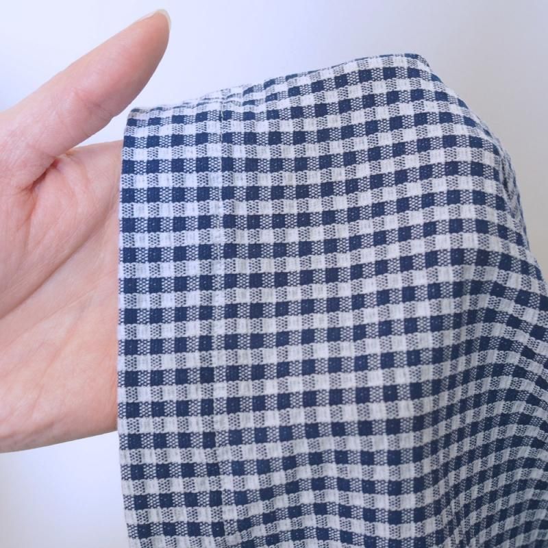 \使いやすいギンガムチェック・ブルーのお色。綿混でストレッチ性の高いサッカー調素材です。/