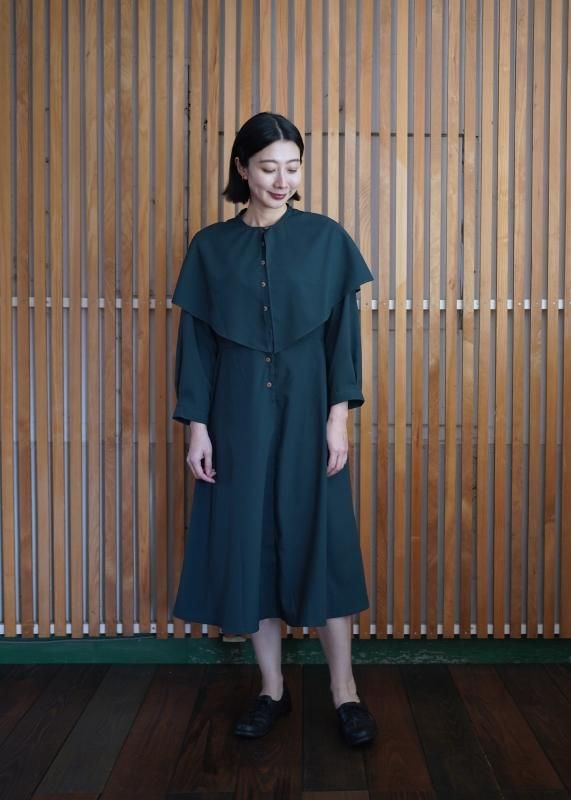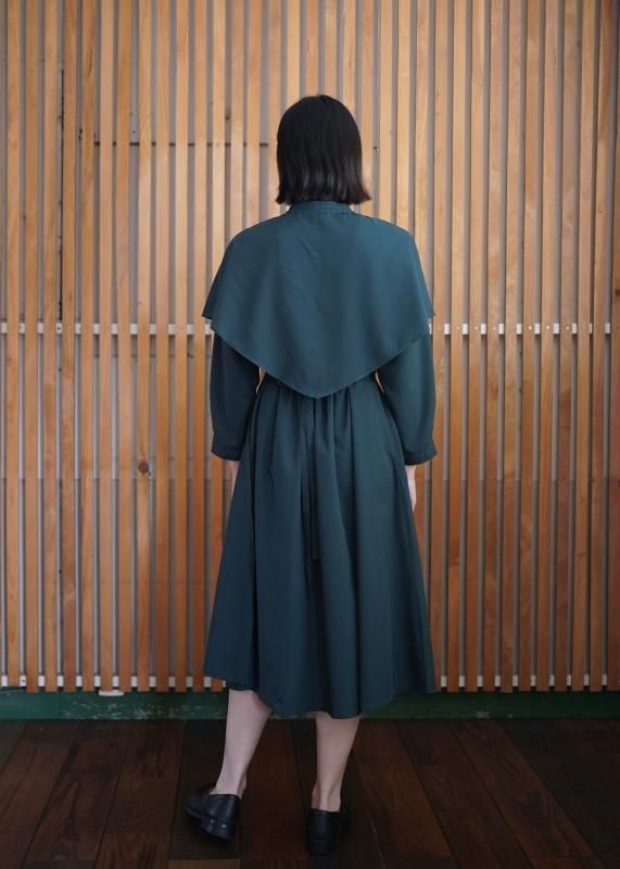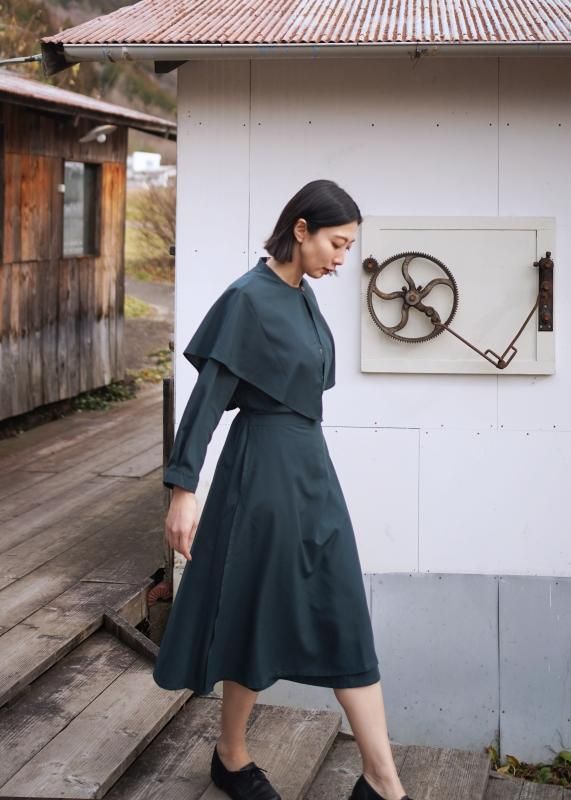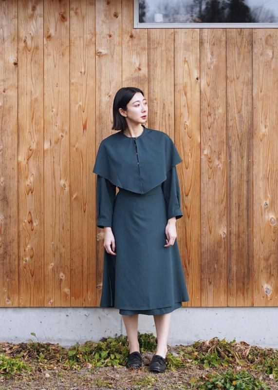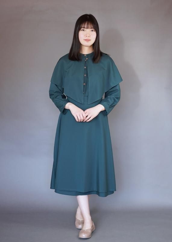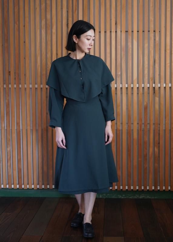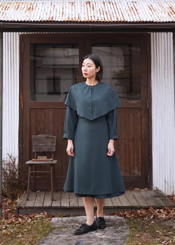 スカートは女性らしい正統派のロングのフレア型。大きな襟のようにも見えるケープは昔ながらのデザインですが洗練された品の良さを演出してくれます。