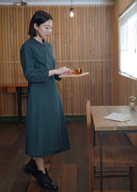 フレアスカートは膝が十分に隠れる丈。動きやすく上品に見えるバランスの良い丈感を追求しました。エプロンとスカートの丈には敢えて差を出しています。生地の重なる束感が、他ではなかなか見つけられないユニークなポイントでもあります。