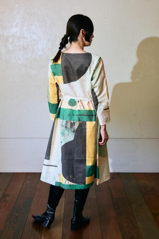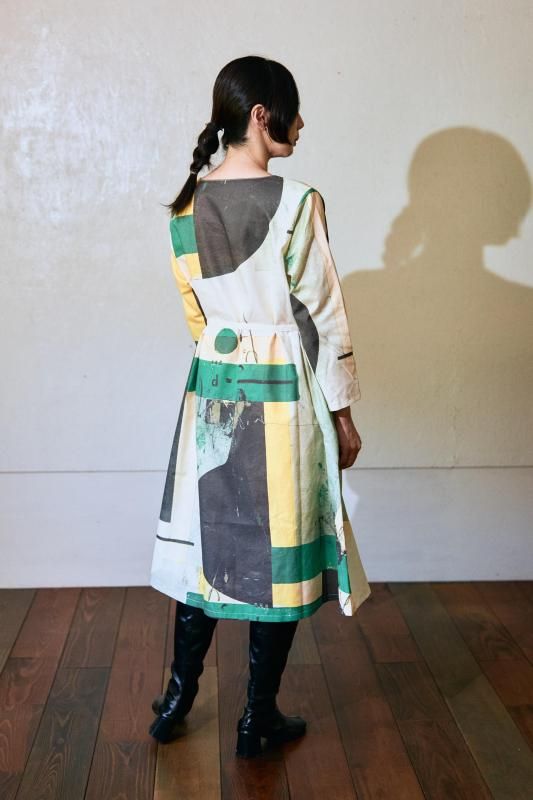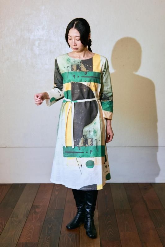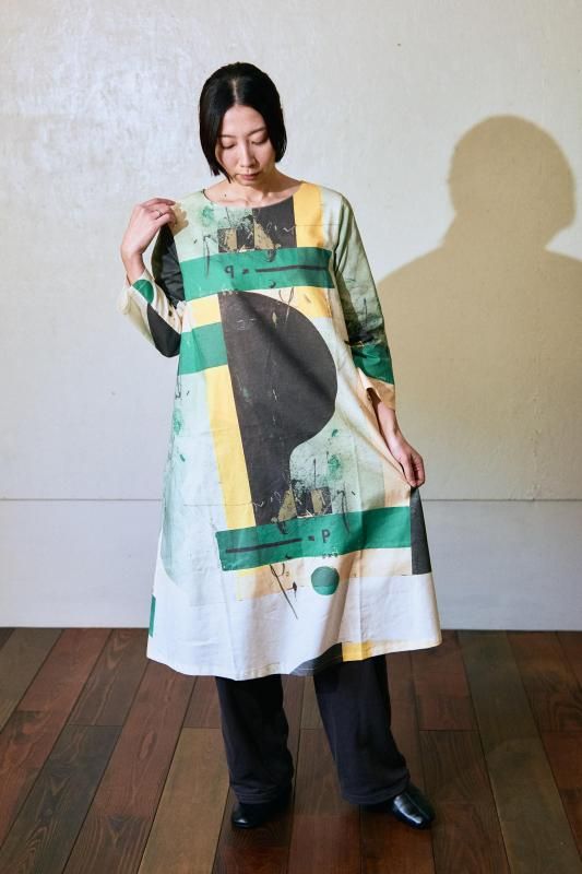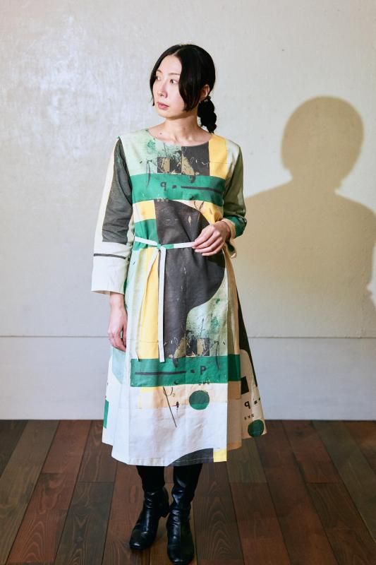 \日常の中に、小さなアートを纏うようなワンピース。緑を基調にした抽象画のテキスタイルです/