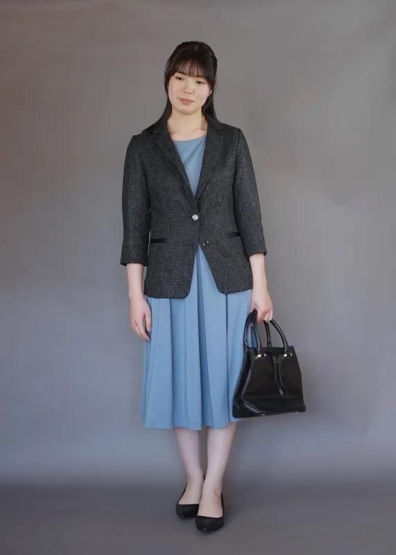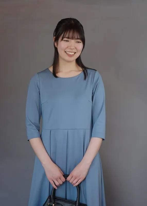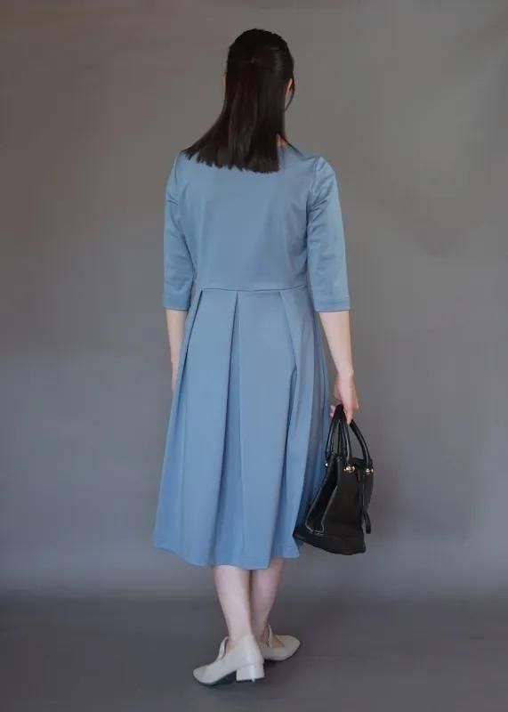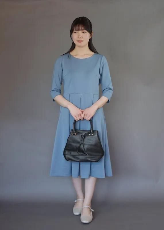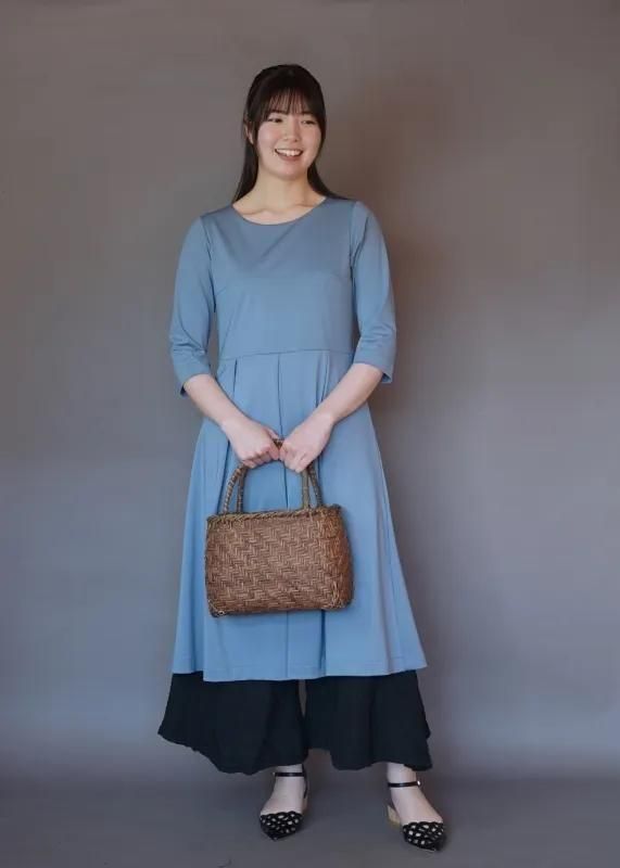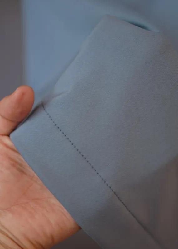 \優しげな印象のくすんだブルーの無地一色です。シワになりにくく、ストレッチの効いた一年中使えるスタンダードな生地です/