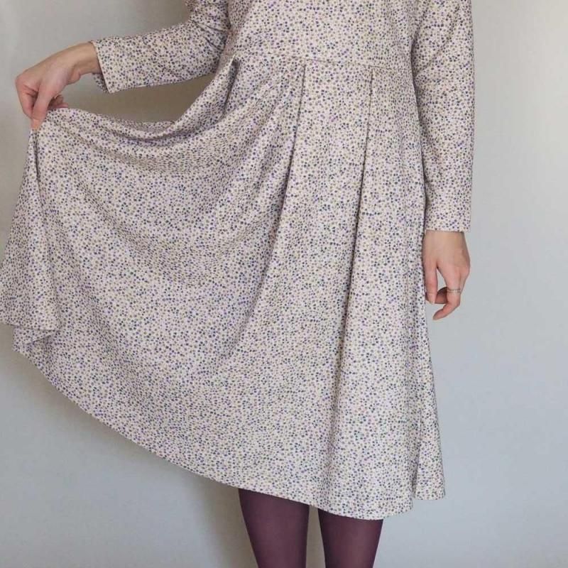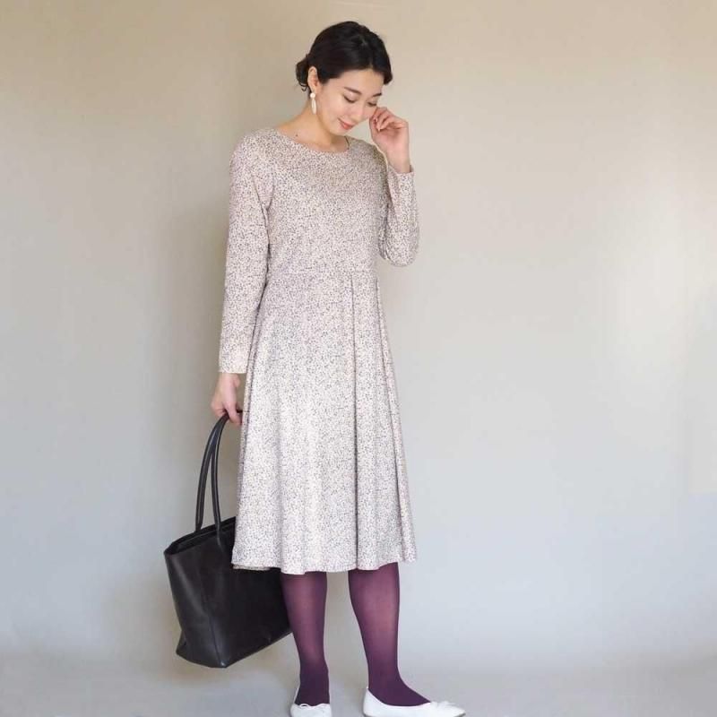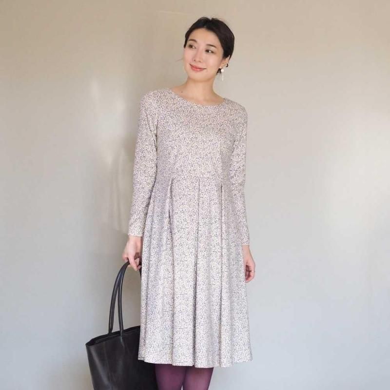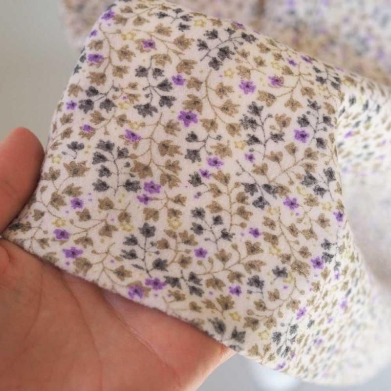 ・とても軽量な生地です。肌触りの良い起毛素材が暖かい印象。パープルがアクセントの落ち着いた小花柄です。遠くから見ると細かいドット柄のようにも見えます。ナチュラル&リラックスな雰囲気で、肩の力を抜いて過ごしたい日などにおすすめ。